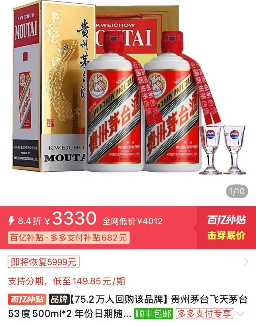 值得一提的是,本次贵州茅台发布的线上销售渠道,未见有拼多多字样。投资快报记者注意到,10月15日凌晨,拼多多上一些店铺飞天茅台的售价低见168元/瓶;双瓶装售价3330元,折合每瓶仅1665元。但在其他平台,飞天茅台每瓶的售价普遍多数仍在1900元之上,其中苏宁超市自营优惠价1856.1元/瓶,京东“自营”PLUS会员价1920.6元/瓶,天猫超市售价1980元/瓶。