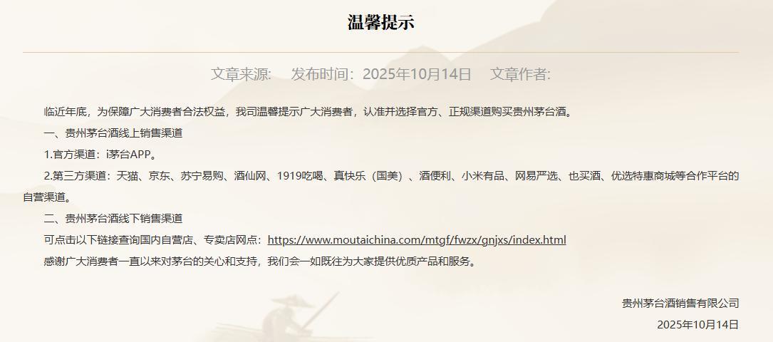 10月14日晚间,贵州茅台在其官网发布《温馨提示》称,临近年底,为保障广大消费者合法权益,贵州茅台酒销售有限公司温馨提示广大消费者,认准并选择官方、正规渠道购买贵州茅台酒。